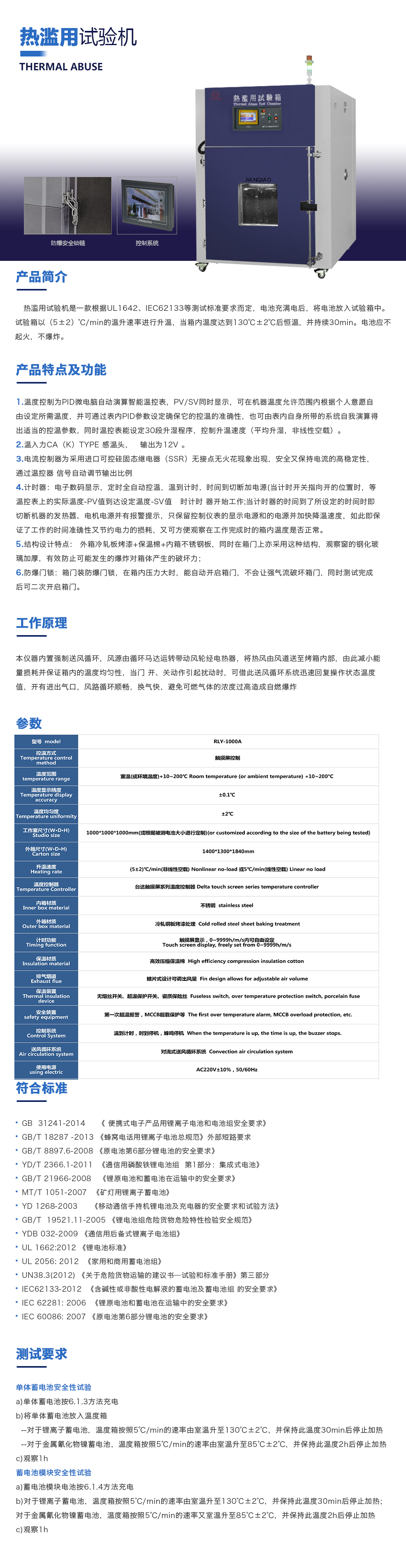 產(chǎn)品型號(hào):JQ-8103 品牌:劍 喬 用途:熱濫用試驗(yàn)箱是一款根據(jù)UL1642、IEC62133等測(cè)試標(biāo)準(zhǔn)要求而定,電池充滿電后,將電池放入試驗(yàn)箱中。試驗(yàn)箱以(5±2)℃/min的溫升速率進(jìn)行升溫,當(dāng)箱內(nèi)溫度達(dá)到130℃±2℃后恒溫,并持續(xù)咨詢熱線:13829135130