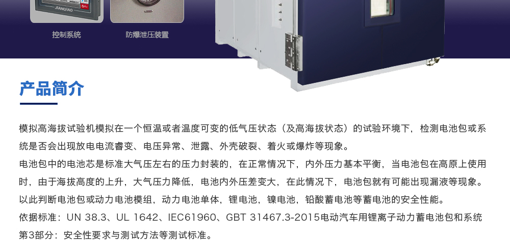 產品型號:JQ-8203-5㎡ (定制款) 品牌:劍 喬 用途:模擬高海拔試驗機模擬在一個恒溫或者溫度可變的低氣壓狀態(tài)(及高海拔狀態(tài))的試驗環(huán)境下,檢測電池包或系統(tǒng)是否會出現放電電流睿變、電壓異常、泄露、外殼破裂、著火或爆炸等咨詢熱線:13829135130